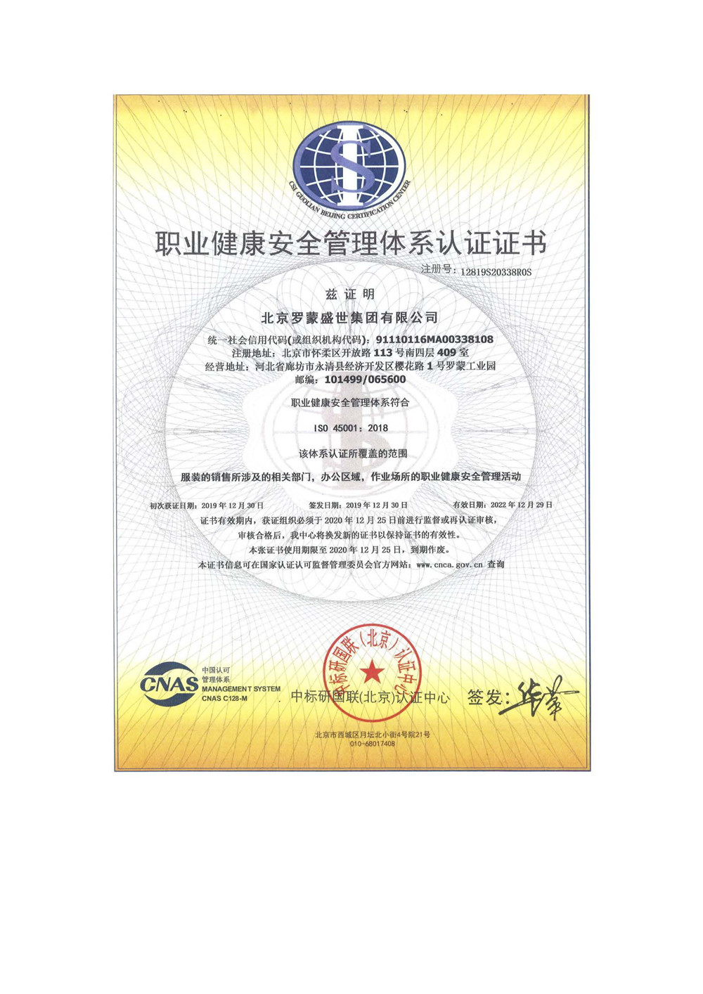 職業健康安全管理體系認證證書